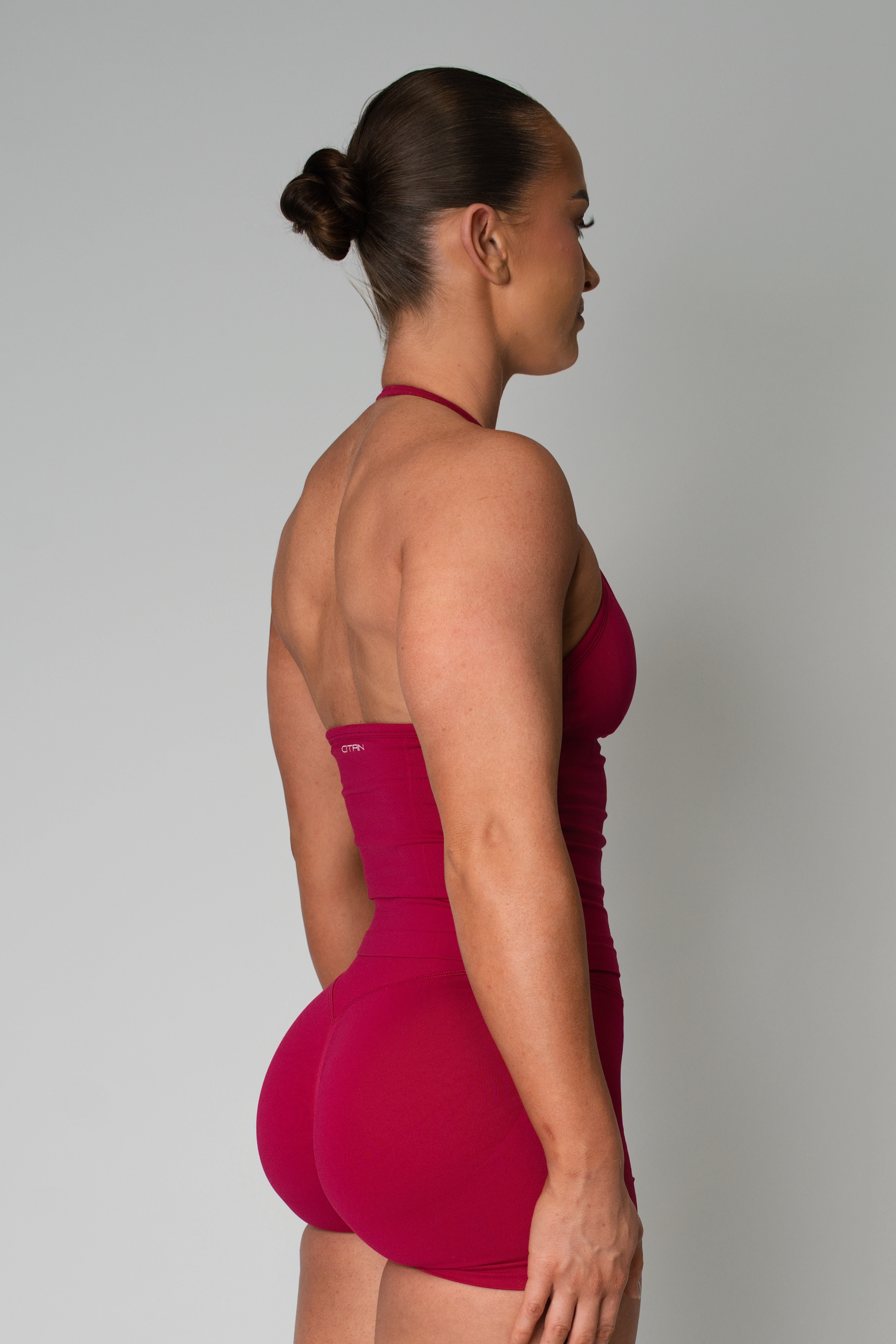 TRUE SHAPE MINIMAL RUCHED HALTER CROP - BERRY